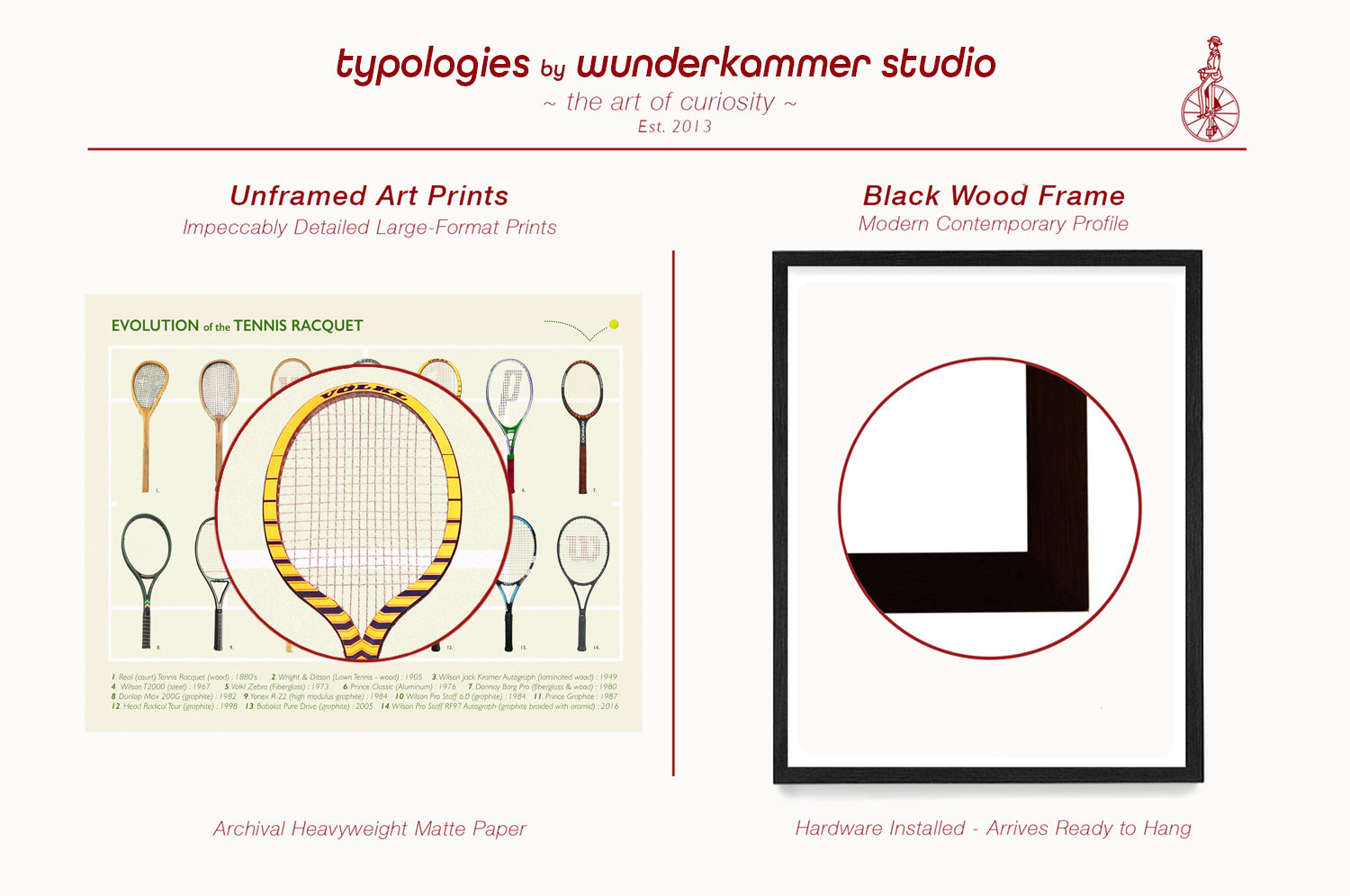 Tennis fans and players will love this piece of visual history as they can trace the origins of the sport from the beginnings "Real Tennis" through to todays graphite hybrids used by Roger Federer. This unique poster features 14 of the most iconic developments in racquet technology, design, and popular use at the highest levels of the sport.